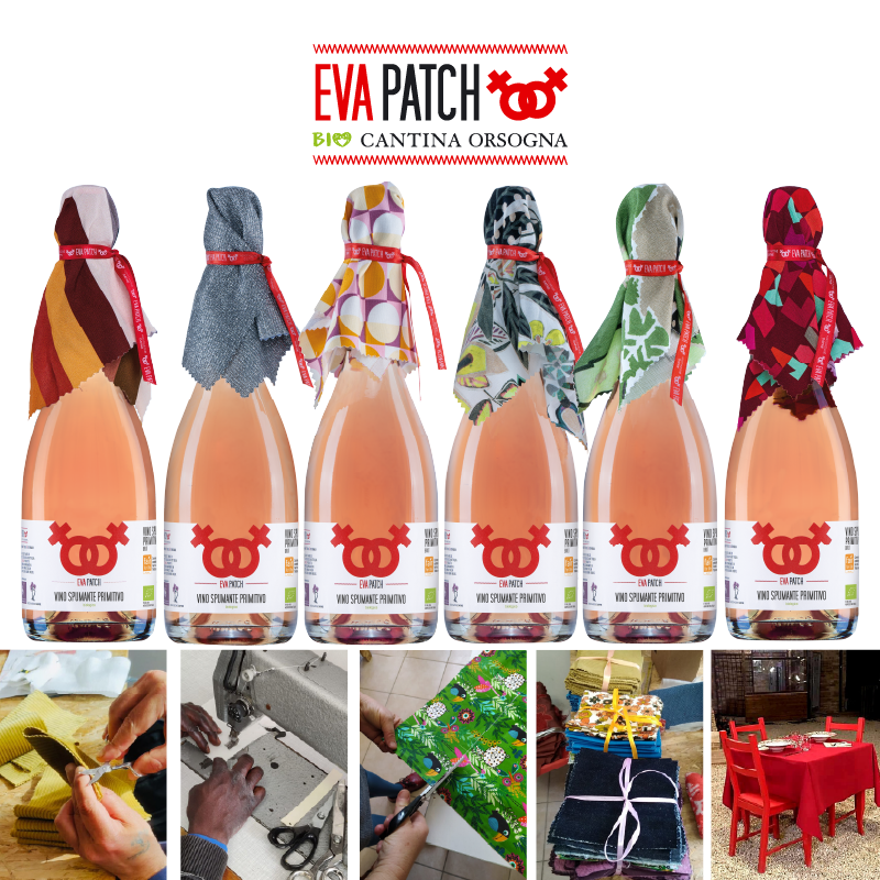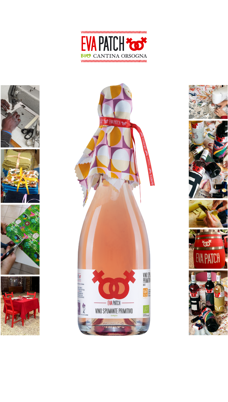 Le stoffe dei frangini con cui sono avvolti i tappi degli spumanti biologici e vegani EVA PATCH sono pezzi unici confezionati dalle donne accompagnate in un percorso di rinascita da vissuti di violenza di genere dai centri antiviolenza gestiti da Dafne ETS.