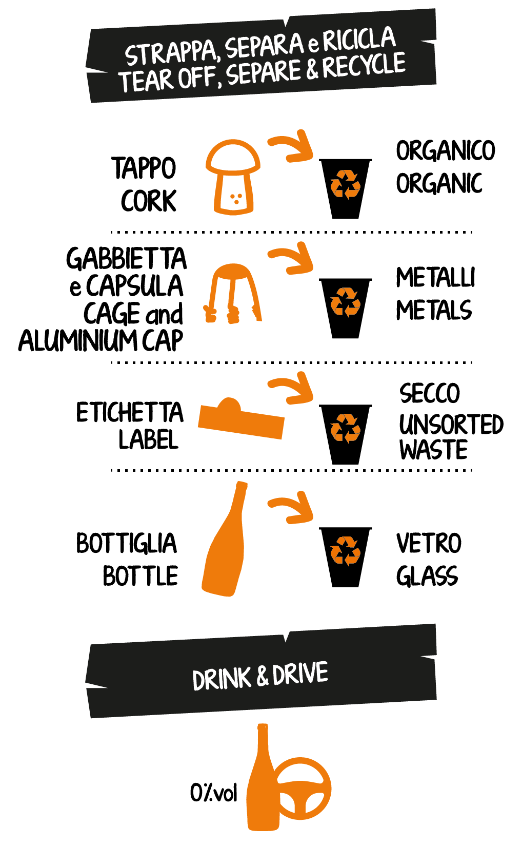 Con etichette facilmente rimuovibili dalla bottiglia per essere smaltite separatamente
